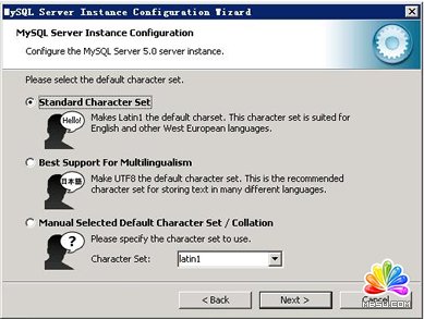 西文编码,第二个是多字节的通用utf8编码,都不是我们通用的编码,这里选择第三个,然后在Character Set那里选择或填入“gbk”,当然也可以用“gb2312”,区别就是gbk的字库容量大,包括了gb2312的所有汉字,并且加上了繁体字、和其它乱七八糟的字——使用mysql的时候,在执行数据操作命令之前运行一次“SET NAMES GBK;”(运行一次就行了,GBK可以替换为其它值,视这里的设置而定),就可以正常的使用汉字(或其它文字)了,否则不能正常显示汉字。按 “Next”继续。