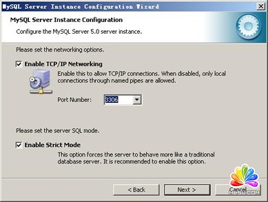 是否启用TCP/IP连接,设定端口,如果不启用,就只能在自己的机器上访问mysql数据库了,我这里启用,把前面的勾打上,Port Number:3306,在这个页面上,您还可以选择“启用标准模式”(Enable Strict Mode),这样MySQL就不会允许细小的语法错误。如果您还是个新手,我建议您取消标准模式以减少麻烦。但熟悉MySQL以后,尽量使用标准模式,因为它可以降低有害数据进入数据库的可能性。按“Next”继续
