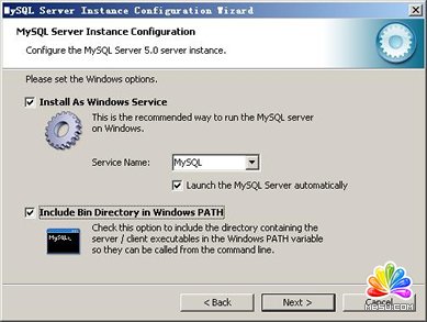 选择是否将mysql安装为windows服务,还可以指定Service Name(服务标识名称),是否将mysql的bin目录加入到Windows PATH(加入后,就可以直接使用bin下的文件,而不用指出目录名,比如连接,“mysql.exe -uusername -ppassword;”就可以了,不用指出mysql.exe的完整地址,很方便),我这里全部打上了勾,Service Name不变。按“Next”继续。选择是否将mysql安装为windows服务,还可以指定Service Name(服务标识名称),是否将mysql的bin目录加入到Windows PATH(加入后,就可以直接使用bin下的文件,而不用指出目录名,比如连接,“mysql.exe -uusername -ppassword;”就可以了,不用指出mysql.exe的完整地址,很方便),我这里全部打上了勾,Service Name不变。按“Next”继续。