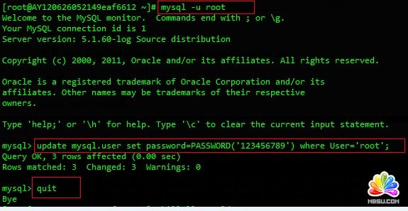 2)在输入update mysql.user set password=PASSWORD('123456789') where User='root'; 更新mysql密码为:123456789