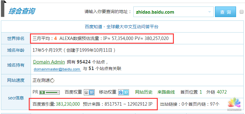 首先说一下百度知道,百度知道作为百度的自己产品,在很多地方都拥有特权,比如我们在搜索某些内容时,大部分情况下百度搜索结果首页你都会发现一条百度知道的展现吧?这就是它的优势。下图是第三方站长工具对百度知道流量估值。