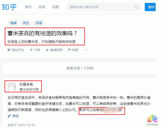 可以在首页看到我在知乎发的帖子,而且排名相当高,这部分流量就相当精准了,标题就是薏米茶祛湿,而且我注册的账号是红薏米茶,薏米茶招代理,在回答的内容里也加上了我的微信号。所以加我微信的都是意向客户。大家在注册每个平台账号的时候可以用产品名称或者产品品牌加微信号作为账号!