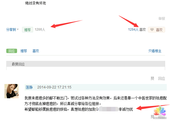 可以看出这个是一个典型的利用高权重和高流量平台综合推广的例子。先利用百度知道这个高流量平台,然后将流量转化到高权重平台,最终完成流量转化。还有一点大家可以看到,这个博客2014年就没有再更新过,但是搜索“卜喆珣告别痘脸不留印”依然排名在首页,所以这种方式一旦运营操作起来,排名会相当的稳定!