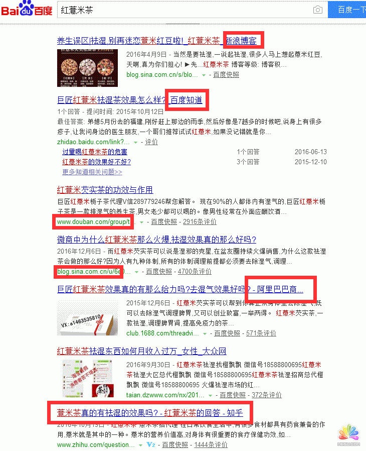 我们常说的高权重平台指的是一些高权重的论坛、微博等。例如:天涯、豆瓣,优酷、贴吧等等。先看一个利用高权重平台进行网络推广的例子。例如:在百度搜索“红薏米茶”。