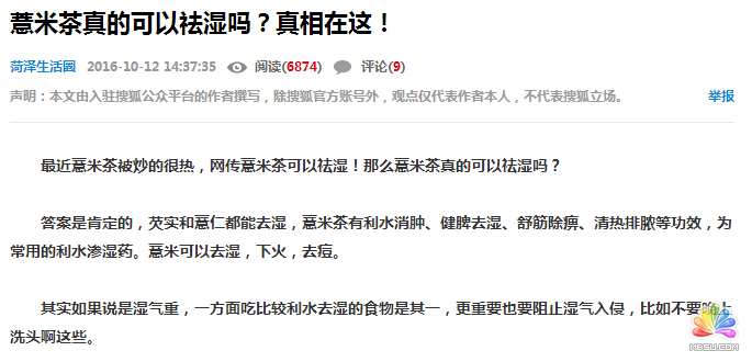 接下来分享一下,我自己做的案例,利用自媒体平台引流的方式,就拿搜狐自媒体举例吧,我在这个平台发布了一篇文章“薏米茶真的可以祛湿吗?真相在这!”,其实说白了这也是一个标题党,然而搜狐呢也比较喜欢这种标题党,在百度排名非常高
