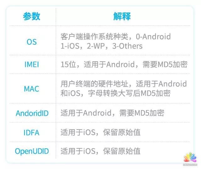 监测代码是指那些具有客户端信息收集功能的代码。它的主要工作,是将客户端的信息以参数的形式拼凑成URL,并以HTTP请求的方式传给第三方,告知“谁,在什么时候,看到了来自哪个媒体展示的,哪个广告主的广告”。以移动端为例,常见的客户端参数有如下几种(数据来自《中华人民共和国广告行业标准》):