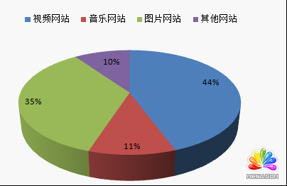 通过分析四月的分享数据,我们将网民所分享的页面内容根据展现形式分为:视频、音乐、图片几类,从不同类别下抽取200个网站的分享数据进行统计对比,得出如下结果: