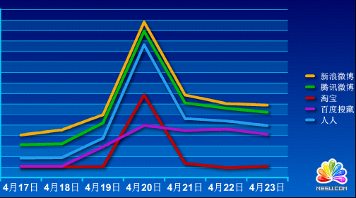 从上图我们也可以分析出,电子商务类网站的分享数据的急剧增长一搬呈现于活动开始前的2-3天内,伴随着网络、电视等各种广告的大肆宣传,网民的分享也会日趋增长,但是往往一个极值之后会有不同程度的回落,这也意味着网民对于活动本身的价值开始关注。