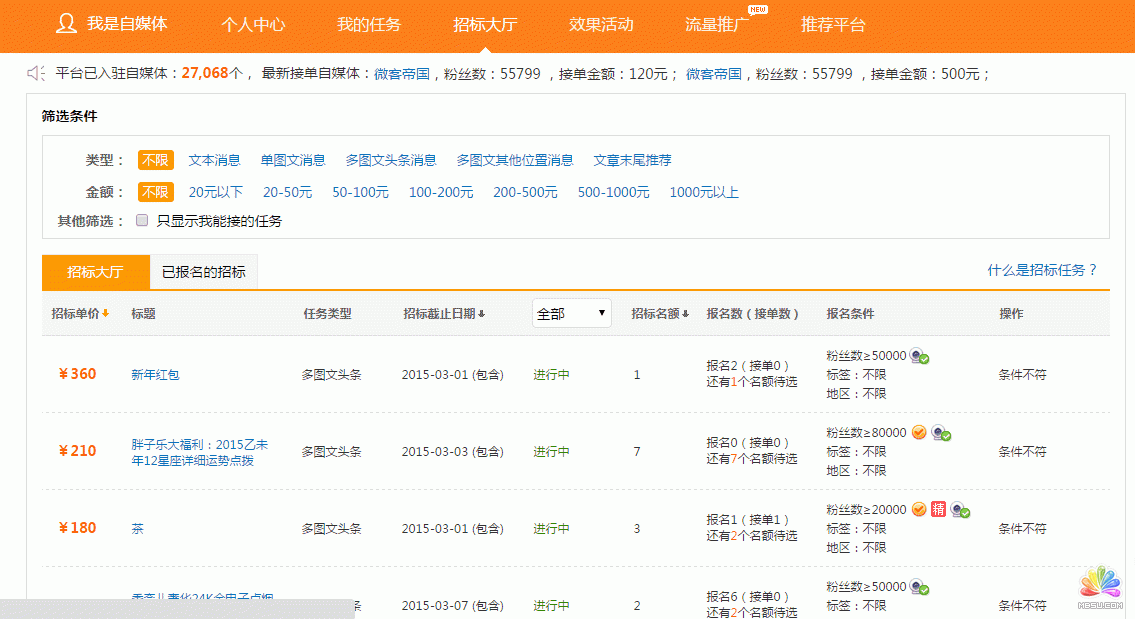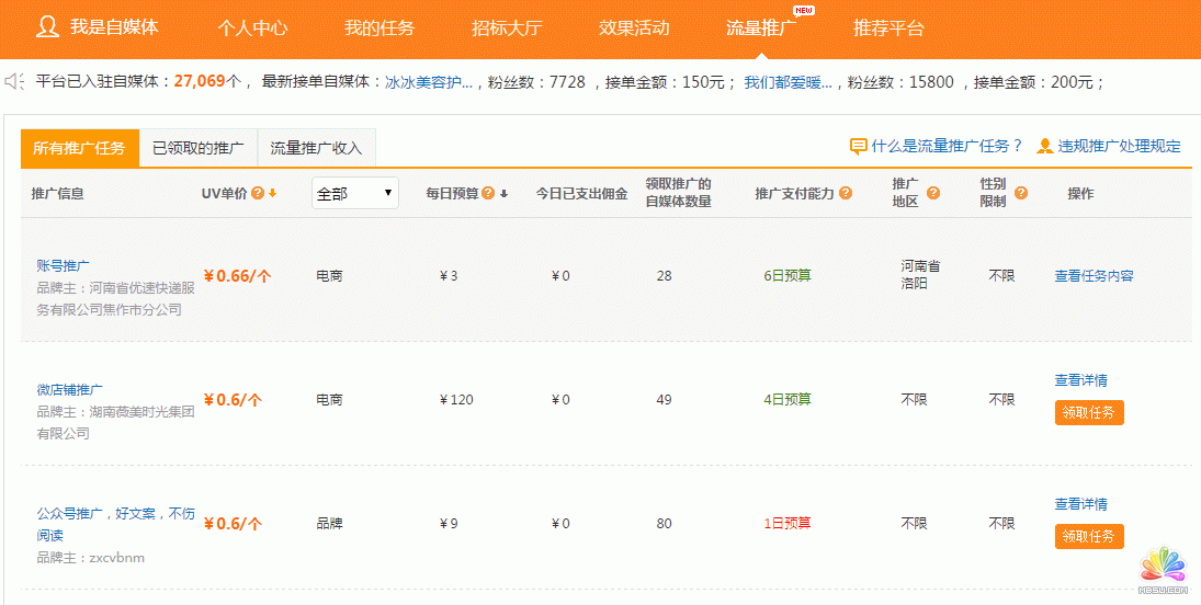 自媒体可以在这里接收任务,通过完成品牌柱的任务来获取利益。