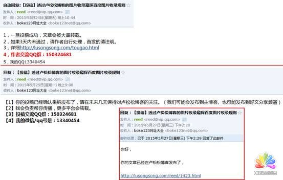 2、在投稿的时候,会收到设置好的默认回复邮件;在投稿被采纳和发布的时候也会有邮件提醒,比较人性化,而且有被尊重的感觉。