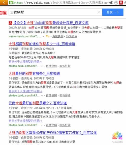 最终效果,搜感通别墅及大理别墅第二页有5条百度知道有排名,对于企业及这个地产项目而言,这果是企业所追求的。