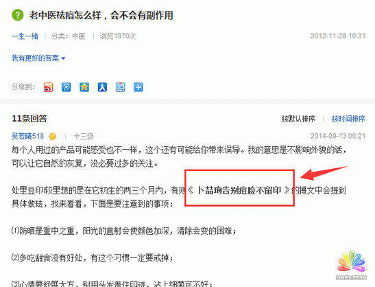 这种方法最常见的方法是软文推广,例如:百度搜索“老中医祛痘怎么样,会不会有副作用”,可以看到其中有个答复。