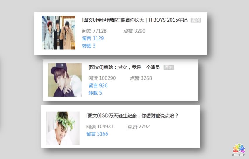 (3)陆续发布有关他们爱豆的文章。初期的对策是发布有关几大明星的文章,TFboys、鹿晗、bigbang等,这种类型的文章都得到了很高的阅读和转发量,轻松破十万。