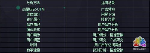 简单列了几个分析方法和应用场景。第一是流向标记,这个大多数用在广告投放,就是流量标记。只有流量标记才能清楚的知道哪个投放标准和渠道是优质的,哪个渠道的用户是我们想要的?下一步就可以加大预算或者提高。