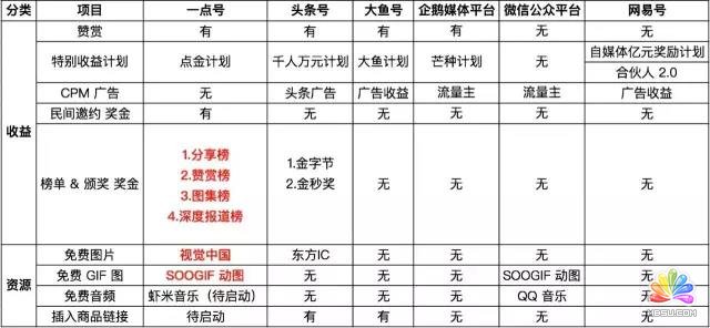 大家请看一位自媒体人统计的表格。包括一点资讯的一点号、今日头条的头条号、网易的网易号、UC的大鱼号、企鹅的自媒体平台,以及微信号。通过这张表格,你可以看到,平台给自媒体人带来了哪些利益。