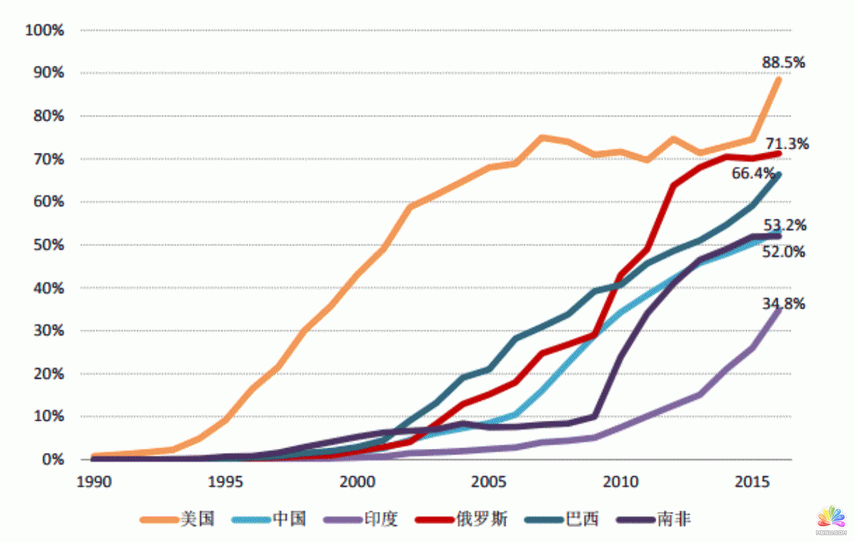 金砖国家与美国互联网渗透率比较,数据来源:世界银行、CNNIC、internet live stats