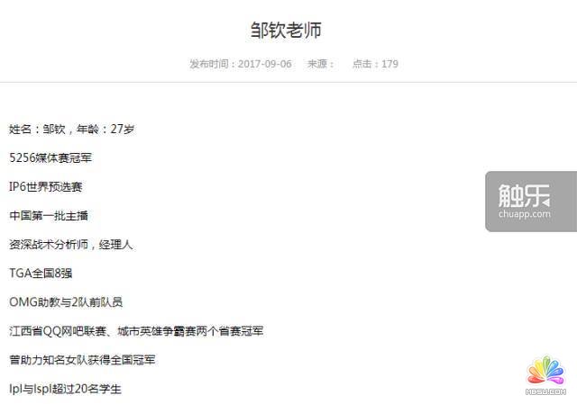 也许他真的很忙,我是在第二天见到他的,因为第一天的时候,接待老师没法联系到他。邹钦先生的身份是“蓝翔电竞负责人”,但在王老师的介绍中,他只是”电竞专业的老师”。不管怎么说,他毕竟是我在蓝翔见到的唯一一个和电竞专业有关的人。而且,在蓝翔电竞学院官网“师资团队”一栏的所有人里,邹钦唯一拥有个人简介。他的介绍是:“5256媒体赛冠军、IP6世界预选赛、中国第一批主播、资深战术分析师、TGA全国八强、OMG助教与2队前队员、曾助力知名女队获得全国冠军、LPL与LSPL超过20名学生”。在侵权使用电竞女主播MISS照片用作宣传并被批评后,蓝翔对电竞学院官网进行了改版,有关教师的具体介绍资料都已经被删除。