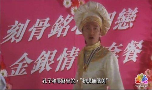 史提芬周:但系我哋趁住重有些少时间呢,想同大家介绍一下唐朝新推出慨「刻骨铭心初恋金银情侣套餐」,孔子同耶稣都讲过,「初恋无限美」,所以我哋拣咗呢个题材。加上高贵既用料,每个套餐只系卖九十九个九毫九,一嚿水都唔使呀阴功!