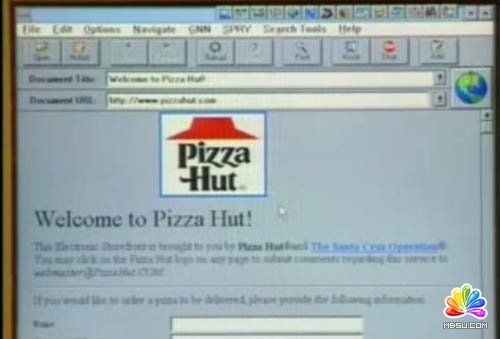 这是CompuServe的另外一项功能,“网页浏览器”,名为air mosaic,这是当时必胜客(Pizza Hut)的主页。