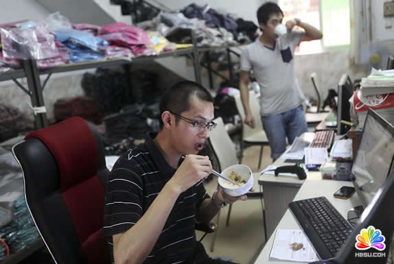 淘宝店的客服们边吃饭边关注着买家的问题。