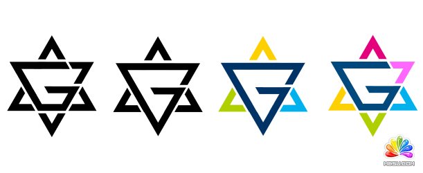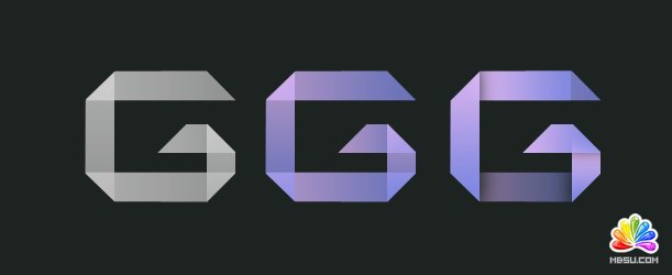 我们尝试着用图层的变化关系来寻找思路。这张图上的“G”字,我们可以看作是1步、2步、3步。可以看出是一张纯色的透明到渐变色的效果,再到多渐变色图层叠加而产生的效果。因为我想看到比第2个G字更浓烈的对比会是什么样子。